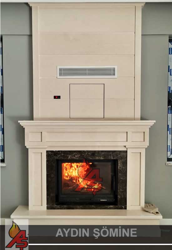 Odunlu şömine olarak tasarlanmaktadır. Düz model olarak geçmektedir. Şömine alt tarafı beyaz doğal antalya taşından yapılmıştır. Hazne çerçevesi doğal granit ile çerçevelenmiştir. İçerisinde döküm şömine haznesi kullanılmıştır. Böylece ısıdan daha fazla faydalanabilinmiştir. Şömine haznelerimiz 2 yıl garanti kapsamındadır. Üst tarafında ısı odası tasarlanmıştır. Menfezden sıcak hava odaya verilmektedir.